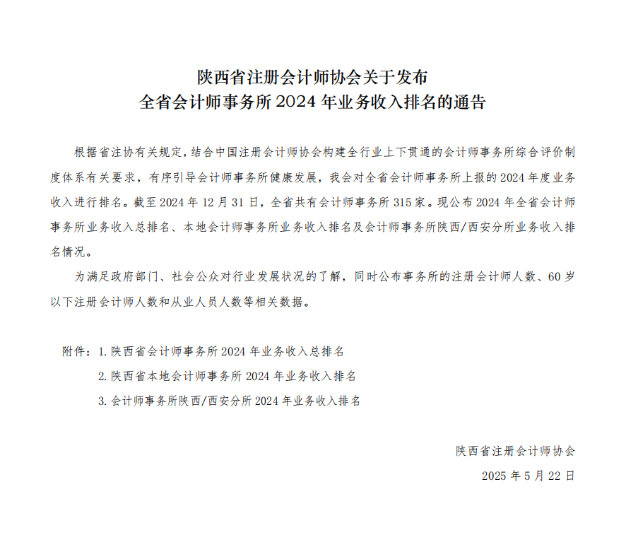 陕西省注册会计师协会关于发布全省会计师事务所2024年业务收入排名的通告