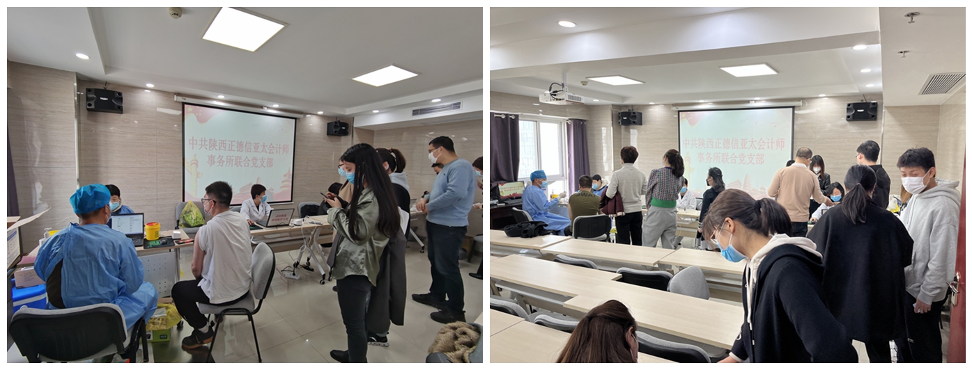 为进一步做好疫情防控工作,保障员工健康安全,2022年3月24日,陕西正德信亚太会计师事务所联合党支部邀请西安市长安区灵沼街道卫生院上门开展新冠肺炎疫苗加强针接种工作。