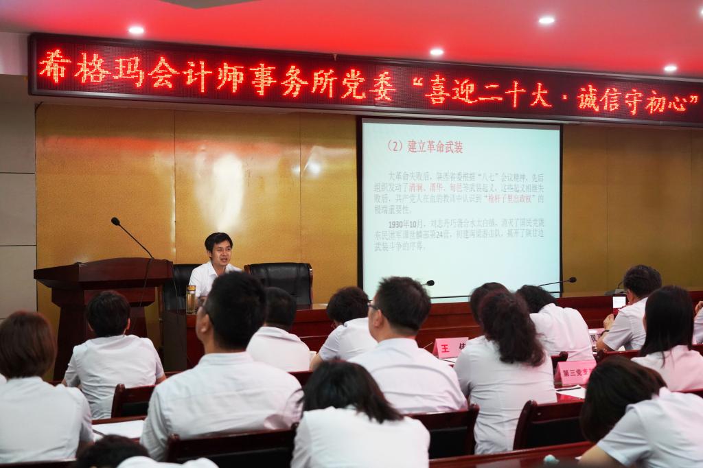 伟大精神忆初心,牢记使命再奋进。党委书记、首席合伙人吕桦在讲话中对全体党员干部提出了四点要求:一是在学思践悟中深入党史学习教育,二是在坚定信念中践行初心使命,三是在真抓实干中弘扬党的优良传统,四是在机遇和挑战中发扬改革创新精神。他号召大家要始终以习近平新时代中国特色社会主义思想为指导,持续推动党史学习教育常态化长效化。专业服务机构作为服务国家经济建设一支不可或缺的重要力量,各级领导干部和全体党员要以身作则,从党的百年光辉历史中汲取精神力量,坚定初心使命,敢于担当重任,以更加奋发有为的精神状态谱写希格玛高质量发展新篇章,以优异成绩迎接党的二十大胜利召开!