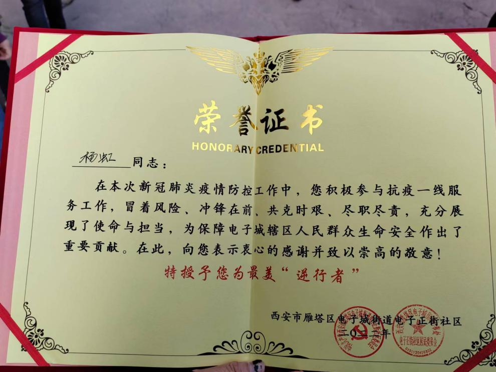 10月26日至28日,每一轮重点区域人员核酸检测中,她都会认真做好自己的工作,消毒、扫码、交接样本及信息数据、核对整理归纳样本等。在所有医护人员和志愿者的共同努力下,10月31日小区实现全面解封。正是因为她的勇气、担当和细心,西安市雁塔区电子城街道电子正街社区为杨虹颁发了荣誉证书,授予“最美逆行者”称号!