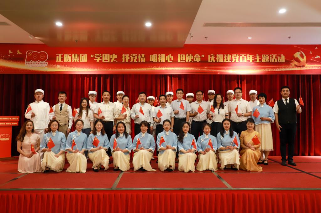 集团党委副书记李伟主持,集团党委书记、总经理高旭致辞并介绍正衡集团党建工作及党史学习教育有关情况,宣读了预备党员名单并举行了入党宣誓仪式,5名优秀同志被发展成为预备党员,13名同志成为积极分子,同时集团党委委员为上述人员赠送党史学习教育书籍。随后集团各支部书记为各团支部授旗。预备党员、积极分子及员工代表依次上台作表态发言。