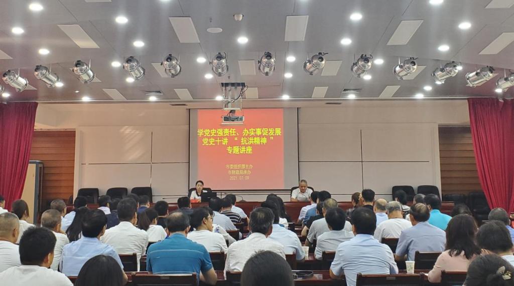 7月9日上午,由宝鸡市委组织部牵头,市财政局、市会计行业党委承办的全市非公经济组织和社会组织“学党史强责任 办实事促发展”党史十讲“抗洪精神”专题讲座,在宝鸡市财政局举行。