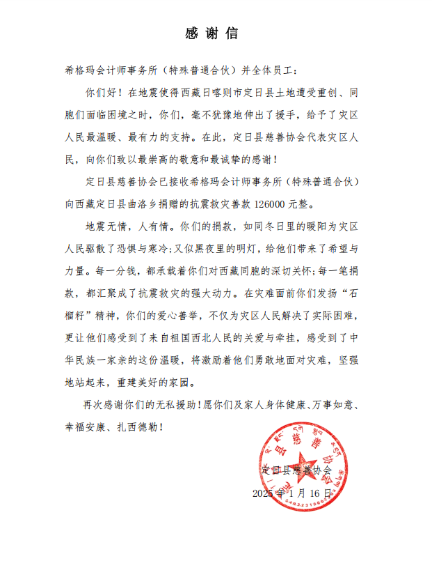 希格玛会计师事务所党委在得知地震消息后,紧急召开会议,第一时间通过公益渠道向定日县捐款126,000元,并援助急需物资。同时,派遣人员前往曲洛乡灾区现场开展慰问活动。定日县慈善协会代表灾区群众对希格玛所及全体员工表达了崇高的敬意和诚挚的感谢,赞扬其爱心善举不仅解决了实际困难,更让受灾群众感受到中华民族一家亲的温暖。