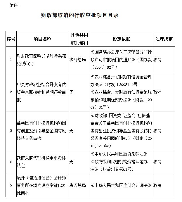 《国务院关于取消和调整一批行政审批项目等事项的决定》(国发〔2015〕11号)决定取消财政部5项行政审批项目,现予公布。